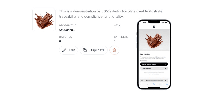 For brands, this module doesn’t just enhance storytelling; it also streamlines compliance and reporting for regulations and frameworks such as ESG and EUDR by linking each product journey to tamper‑proof, audit‑ready records stored in the Open Food Chain solution. Marketing, quality, and sustainability teams can align on a single source of truth, cut manual data work, and bring new transparent product lines to market faster